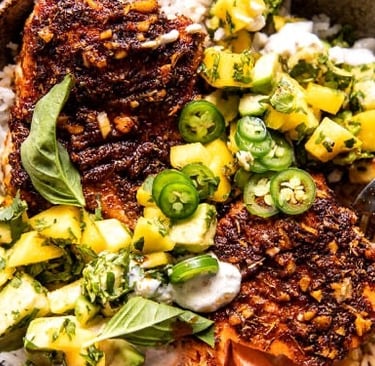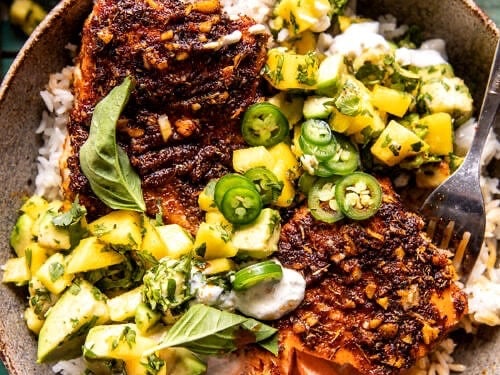 Fire up your taste buds with this BBQ Salmon Rice Bowl with Mango Jalapeño Salsa — a crave-worthy mix of smoky grilled salmon, fluffy jasmine rice, creamy avocado, and a fresh tropical salsa that hits all the right notes: sweet, spicy, and tangy. A healthy dinner ready in 30 minutes!