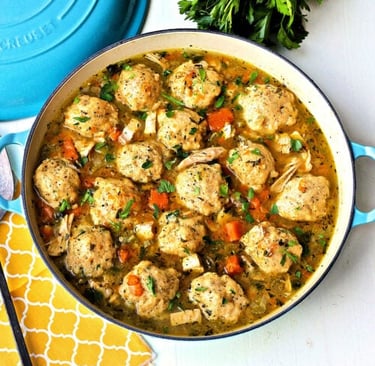 This one is cozy, old-fashioned comfort in a bowl. Think tender chicken, rich broth, herbs, and those pillowy dumplings that soak it all up. Yum!